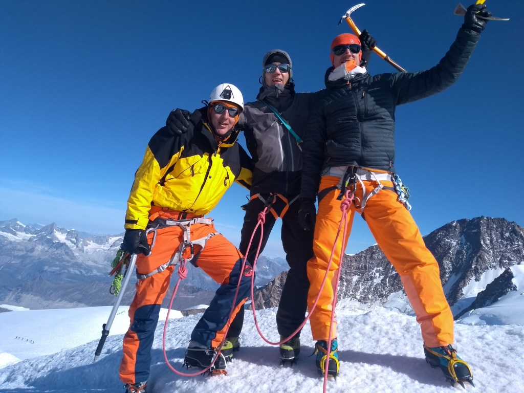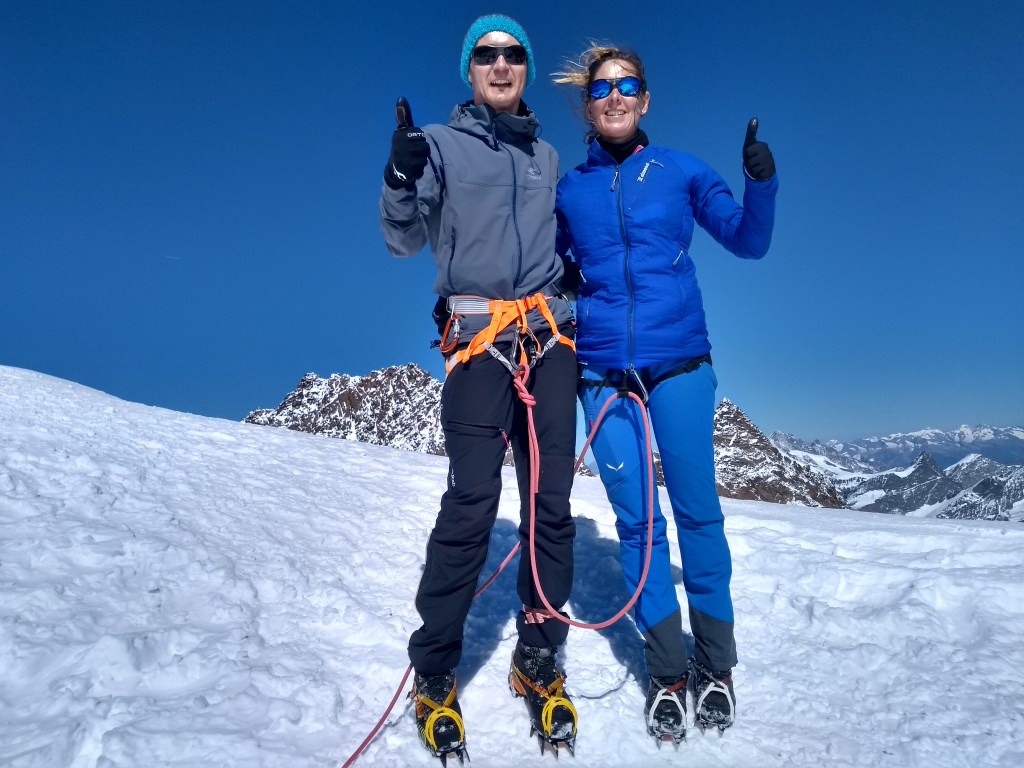 | Tourenprogramm: 1.Tag Besprechung des Tourenprogramms: Treffpunkt um 18:00 im Hotel Bergfreund. Programmbesprechung für die nächsten Tage und eventuelle Planäderungen aufgrund der Wetterlage. Materialausgabe und Überprüfung der Ausrüstung. 2.Tag Über das Breihorn(4164m) zum Rifugio Guide d‘Ayas(3400m): Mit dem Shuttle oder Zug fahren wir in der Früh nach Zermatt. Wir gehen ca. 20 min. durch den berühmten Tourismusort und fahren mit der Seilbahn zum Klein Matterhorn(3882m). In ca 1,5h gelangen wir auf unseren ersten 4000er der Tourenwoche. Wir steigen auf die Südseite ab und in einer langen Gletscherwanderung kommen wir zum Fuß des Pollux. Bei gutem Wetter klettern wir noch über den Normalweg zum Gipfel des Pollux. Anschließend steigen wir ab zum Rifugio Guide d‘Ayas. Gz 5-7 h / ↑ 500-800 Hm, ↓ 900-1200 Hm 3.Tag Castor(4223m): Heute steigen wir zunächst den gestrigen Abstiegsweg bis zum Gipfelaufbau des Pollux wieder hinauf. Hier haben wir abermals die Chance den Pollux zu besteigen. Anschließend geht es die steile Gletscherflanke des Castor hinauf. Die letzten 30-40 Meter auf den Gipfelgrat müssen auf den Frontalzacken bewältigt werden. Der scharfe Firngrat bringt uns auf den formschönen Gipfel. Abstieg zum Felikjoch und zur Quintino Sella Hütte. Gz 5-7 h / 800-1100 Hm, ↓ 700-1000Hm 4.Tag Über „Il Naso“ zur Gnifetti(3650m) In einer langen Gletscherwanderung gehen wir zum Steilaufschwung des Naso. Leichte kombinierte Kletterei bringt uns zu einer meist blanken ca. 80 Meter langen Eisflanke. In frontalzackentechnik klettern wir sie hinauf und gehen anschließend über mäßig steile Schneehänge zur „Nase“. Abstieg zum Lysgletscher. Vom Lysgletscher besteigen wir noch die Felseninsel des Balmhorns und die Vincentpyramide. Abstieg zum Rifugio Gnifetti. Gz 8h / ↑ 1000 Hm, ↓ 900 Hm 5.Tag Zum Rifugio Margherita(4545): Wir steigen den Lysgletscher hinauf und besteigen das anspruchsvolle Schwarzhorn, im Anschluss die kleine Pyramide der Ludwigshöhe. Die Parrotspitze überschreiten wir über einen schönen Firngrat. Über den Grenzgletscher steigen wir hinauf zur höchsten Schutzhütte Europas und genießen bei hoffentlich gutem Wetter das gewaltige Panorama. Gz 7 h / ↑ 1300 Hm, ↓ 400 Hm 6.Tag Zumsteinspitze(4554m) und Abstieg nach Zermatt: Kurz nach Sonnenaufgang stehen wir auf dem höchsten Punkt unserer Hochtourenwoche, der Zumsteinspitze. Von dort folgt ein wunderschöner Abstieg über den Grenzgletscher hinab zur Monte Rosa Hütte. Von der Hütte in stetigem Auf und Ab hinüber zum aperen Cornergletscher und zur Haltestelle Rotenboden. Mit der Zahnradbahn hinab nach Zermatt und mit Shuttle oder Zug zurück nach Herbriggen. Gz 7 h / ↑ 600 Hm, ↓ 2300 Hm |